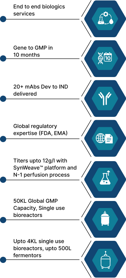With our multiple biologics development and manufacturing sites, we offer a unified global supply chain ensuring continuity, flexibility, and reliability for clinical and commercial programs.